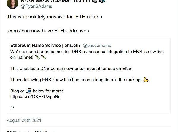新功能意味着DNS域名所有者现在可以导入他们的传统域名作为ENS使用,这是加密货币最广泛使用的区块链命名标准。