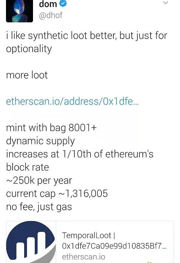 昨晚Loot项目创始人DomHofmann发推称,推出动态供给的新项目MoreLoot。