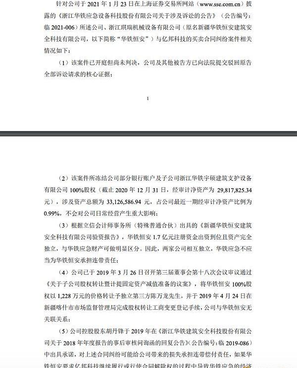 2020年12月,亿邦科技向杭州市中级人民法院提起诉讼,将浙江琪瑞机械设备有限公司(新疆华铁更名后主体)、华铁应急及公司实控人胡丹峰告上法庭,该案已在今年6月开过两次庭但尚未判决。法院已冻结了华铁应急部分银行账户和子公司股权。