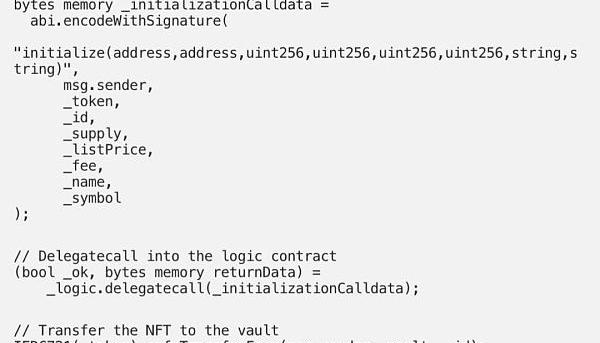 在金库工厂的初始化期间,ERC721TokenVault会创建一个合约,并在每个金库的初始化中重用其逻辑,以节省gas和存储空间。每个金库都有自己的合约,但逻辑只存在于一个地方。该函数用它的参数对初始化函数签名进行编码,然后将调用数据传递给代理,该代理把delegatecall传递给预先创建的代币金库合约。ERC721TokenVault#initialize初始化分割ERC-20代币,给管理员创建总供应,并设置总底价(标价x供应)。在金库初始化之后,它将NFT从所有者处转移到金库。