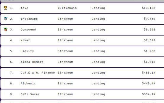Aave主要运行在以太坊以及基于以太坊的Polygon上。目前,Aave的总锁仓金额约为130亿美元,在所有借贷类DeFi项目中排名第一,如下图所示。