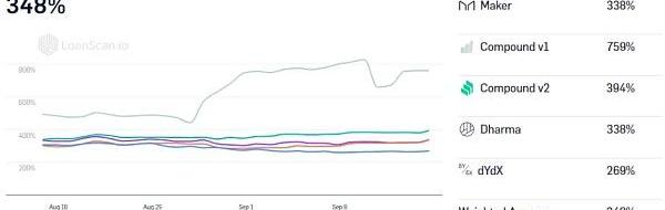 根据DeFiRate的统计,所有平台的平均抵押率高达348%。?