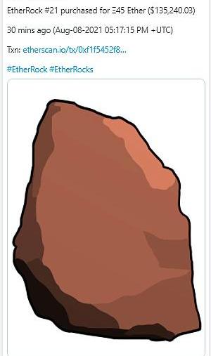 所有这100块「石头」都已售出,现在这些NFTs的二手价格正在飞涨。上周末,两枚EtherRocksNFT的售价都超过10万美元,其中编号为#21的EtherRock在上周日的售价达到了45ETH(约合135,240美元),见下图: