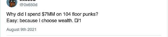 7月底的几件事似乎引发了这股热潮。7月30日,一位匿名买家花费700万美元在一个区块中购买了104个CryptoPunk。他们有选择地购买了市场上104个最便宜的CryptoPunk,大大提高了底价(“底价”指的是一个集合中最便宜的NFT的价格)。他们将CryptoPunks视为一种长期的价值储存手段。
