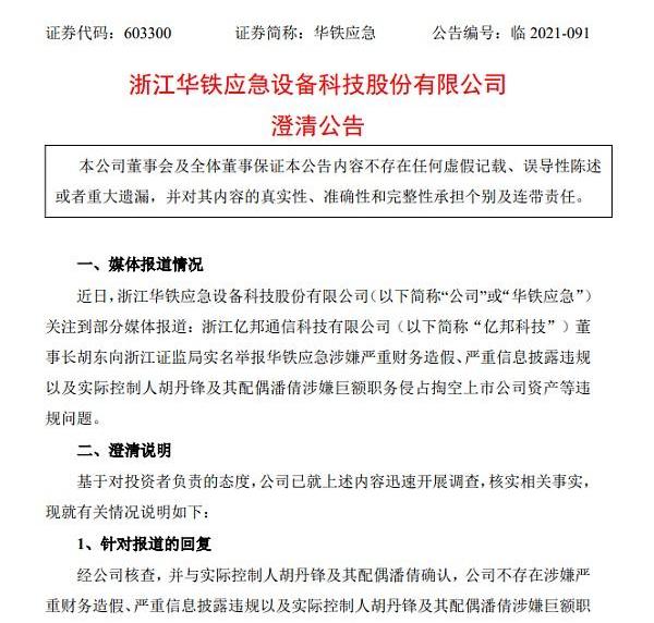 8月8日下午,亿邦国际举行新闻发布会,公司董事长胡东表示,已于上周五向浙江证监局实名举报华铁应急涉嫌严重财务造假、严重信息披露违规以及实际控制人胡丹峰及其配偶潘倩涉嫌巨额职务侵占掏空上市公司资产等违规问题。