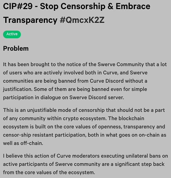 当然,可能会有人批评这种说法,说这些DeFi团队和他们的投资人绝不会重新把审查制度作为解决方案。然而有一些例子表明,审查制度已经在发生了。我说的不是在Discord、Twitter和Telegram上不断的封杀和禁言,而是实际从治理框架本身删除社区成员/他们的帖子。