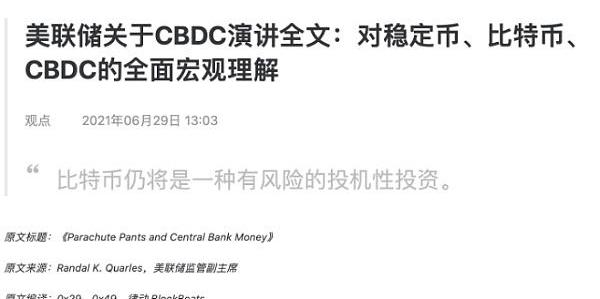 2021年6月28日美联储监管副主席访谈,对CBDC和美联储官方观点有不同看法