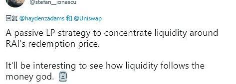 ReflexerLabs是算法稳定币RAI的开发团队,Reflexer的开发者在推特中回复正在建立一种将流动性集中在RAI赎回价格周围的被动LP策略。