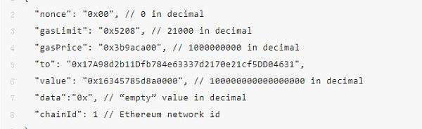现在我们已经完全理解了区块链交易的特性,我们已经准备好了,可以去创建一笔以太坊交易了。我们从一笔简单的转账交易开始:转账0.1ETH给地址?0x17A98d2b11Dfb784e63337d2170e21cf5DD04631。交易可以用JavaScriptObjectNotation格式来表达,在创建这笔交易时,我们可以在?MyEtherWallet?上看到这些信息:
