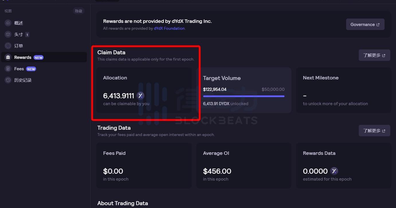 进入Rewards后,将显示该地址是否有DYDX空投可以领取。
