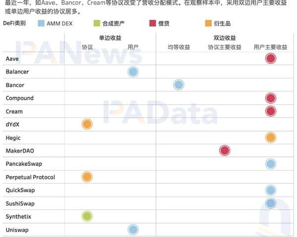 PAData观察了15个协议的收入分配模式,其中,Aave、Bancor、Cream、MakerDAO在过去一年中改变了营收分配模式。Aave和Cream从单边用户收益模式转为双边用户主要收益模式、Bancor从单边用户收益模式转为双边均等收益模式、MakerDAO从单边协议收益模式转为双边协议主要收益模式,这些模式的转变基本发生于去年8月以后。?