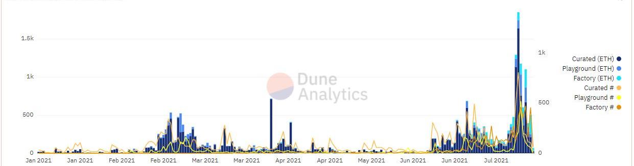 同ArtBlocks略有不同,SuperRare的定位是更加高端的艺术品市场。加入SuperRare的艺术家都需要经过严格筛选,高水准的艺术家和收藏家在这个平台上可以进行交流和社交。SuperRare平台在第一次的NFT销售中收取行业内相对较高的15%的手续费,但由于其高艺术水准的特性这样的收费也算合理。目前,SuperRare的总销售额超过8100万美元,NFT份数超过20000个。发展趋势方面,SuperRare的热度在2021年3月到5月到达顶峰,而近两个月则有所遇冷。我们认为,对于一个定位高端的艺术品市场,狂热的交易很难成为常态,而社交方面的价值才是随着会市场沉浮一直沉淀的核心价值。