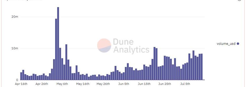 Opensea是全球最大的综合性NFT交易平台,涉及的NFT包括艺术、音乐、域名、体育等。同时,Opensea还提供有免gas手续费铸造、出售NFT的服务,这一点在市场鹤立鸡群。根据DuneAnalytics上的数据,2021年2月之前,Opensea上的NFT交易一直不温不火。来到二月份,NFT市场整体交易量呈现爆炸式增长,Opensea也不例外。整个二月份,Opensea的总交易额相比一月增长了十倍以上,达到了9500万美元以上,总交易NFT数增长了四倍,达到4万余件,活跃用户增长了一倍,为15000余人。随后,伴随着NFT市场的火爆,Opensea的热度也始终保持在较高水平,于5月4日达到了单日交易额2300万美元的最高纪录。