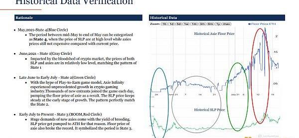 2021年6月底至7月初,状态2(绿圈):随着“边玩边赚”游戏模式的炒作,AxieInfinity在加密货币市场经历了前所未有的增长,每天都有成千上万的新玩家加入游戏。因此,Axie的底价被拉高,SLP价格在增长的早期阶段保持稳定。该模式完全符合状态2。