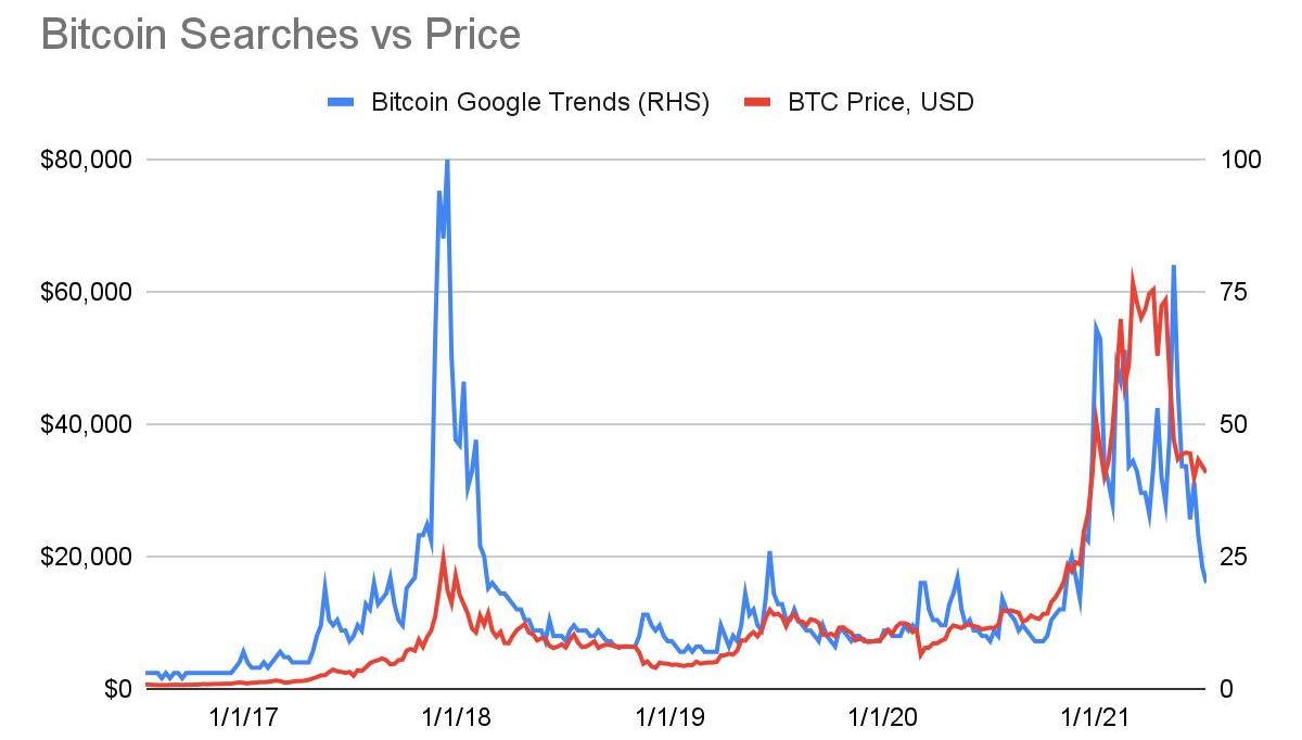 今年比特币的相对搜索热度尚未超过2017年底的水平。这可能表明许多散户投资者和公众在今年最近的价格变动之前就已经了解比特币。机构投资者的入场是比特币在2020和2021年取得成功的重要原因之一,而谷歌搜索不会轻易捕捉到这一点。?