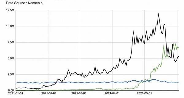 Polygon(绿色)vs币安智能链(黑色)vs以太坊(蓝色)上的交易。Cr:?OurNetwork