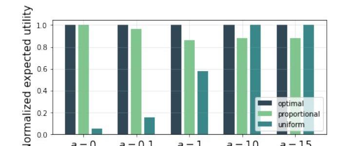 图4:不同风险偏好(?值)的最优、最佳比例及均匀分配策略的预期效用。在风险厌恶程度较低的情况下,比例分配策略的表现明显优于均匀分配。而在较高的风险规避水平下,均匀分配是最优的策略。