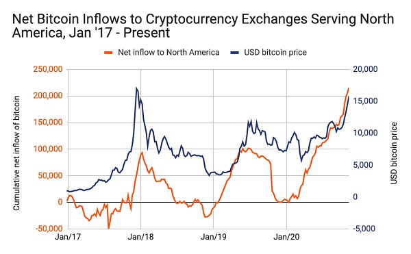 在2017年牛市的早期,北美交易所净损失了比特币,随着价格开始达到峰值,北美交易所成为了净接收者。但这一次,北美交易所一直是绿色的,流入量上升至比过去几个月2017年运行时更高的水平。?