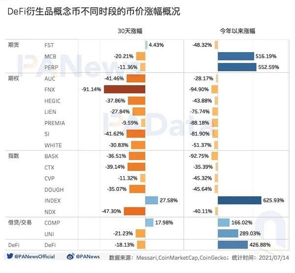 即使将时间维度拉长至今年,DeFi衍生品概念币的涨幅也不及预期。今年以来,DeFi概念币整体的平均涨幅高达426.88%,COMP和UNI这两个借贷和AMMDEX的头部协议代币的涨幅也分别达到了166.02%和289.03%,表现突出。但DeFi衍生品概念币的平均涨幅仅为57.69%,远低于DeFi板块的整体水平,而且这还是受到INDEX、PERP和MCB三个代币极端优异表现影响后的结果,若去除这三个涨幅超过500%的代币,则其余13个代币的平均涨幅会降低至-59.36%,与DeFi整体水平相距更远。