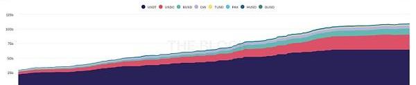 根据TheBlock数据,年初至今,整个稳定币市场增长从289亿美元,增长至1094亿美元,增长超过。