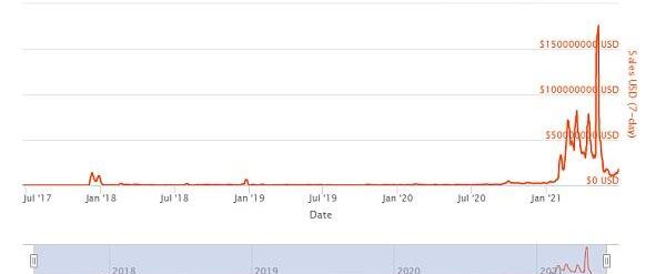 但随后的几年时间,NFT始终处于半温不火的状态。直到2020年下半年,NFT开始频繁出圈,其市场交易规模开始爆发式增长。