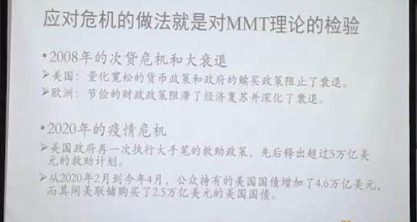 我们说,MMT的主张在一定程度上是合理的,是正确的。央行向银行注入资金。2008年当年是把银行的有资产给置换了过来,使得它变得更加健康来阻止危机的扩散。这个过程就是量化宽松。