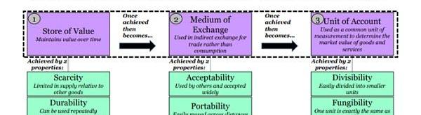 一种商品向货币媒介过渡的演变过程可以粗略地概括如下。它必须具有储存价值的属性,即人们可以合理地假设其市场需求不会随着时间的推移而恶化。当更多的市场参与者意识到某种商品可以储存价值时,他们就可以在彼此之间交换这种属性,尽管它可能还没有被广泛接受。随着这种交换的发生,它被广泛接受的知识成为一个自我实现的预言,它作为交换媒介的使用变得更加频繁。一旦它被足够大的规模接受为交换媒介,使用它作为媒介的参与者将开始普遍以该商品的数量报价他们的商品和服务,直到最后它成为一个共同的记账单位。通过这个过程,市场参与者趋向于一个支持这些功能的货币商品上: