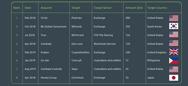 自2013年以来,加密货币行业共进行了350笔交易,价值超过40亿美元。加密货币领域中三个最大的收购方:Coinbase,Kraken和Binance。