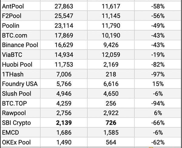 根据TheBlock汇编数据,在过去一个月内,大多数中国BTC矿池的哈希率下降了50%以上。例如,AntPool和F2Pool的哈希率分别下降了58%和56%。
