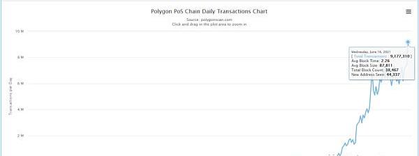 Polygon日交易数整体趋势攀升,6月16日高达9,177,310笔交易。?