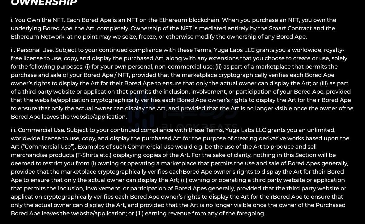 这是因为BoredApeYachtClub将版权中的著作财产权授予给了NFT数字作品持有者,这一点在项目官网的条款细则中有详细的解释。不过持有者只拥有自己持有的那一只猿猴数字作品的著作财产权,使用其他猿猴需要得到其他持有者的授权。