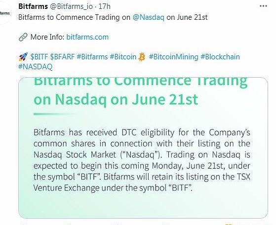 就在昨天Bitfarms宣布其股票将于2021年6月21日在纳斯达克上市交易。