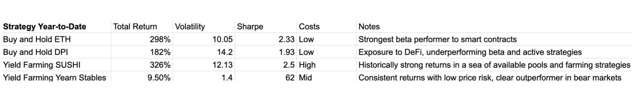 文章将探讨积极参与DeFi的一些独特考虑因素,探讨持有现货ETH、一篮子DeFi治理代币与积极参与收益农业之间的回报差异。将涵盖以下方面的概念和工具:管理收益和风险敞口;衡量被动和主动策略之间的回报差异;参与主动策略的成本。