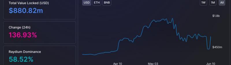 Solana生态内的龙头DeFi也不难猜——Raydium。DefiLlama数据显示,Raydium当前的锁仓量为5.15亿美元,虽然也占据了整条Solana生态?TVL的过半比例,但较5月3日的历史高点9.6亿美元已近乎腰斩。