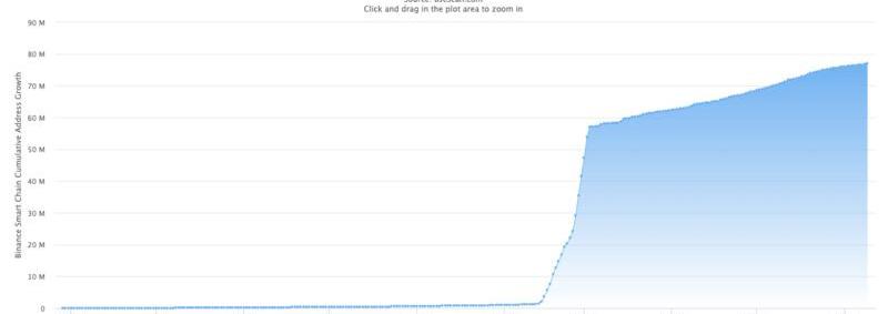 BSCScan图表可以清晰的看出,经历了二、三月份的大爆发,BSC网络的独立地址数量已进入了平稳增长阶段,4月9日,BSC网络的独立地址数量为64202561个,6月9日数据为76998164个,区间增幅为19.93%。?