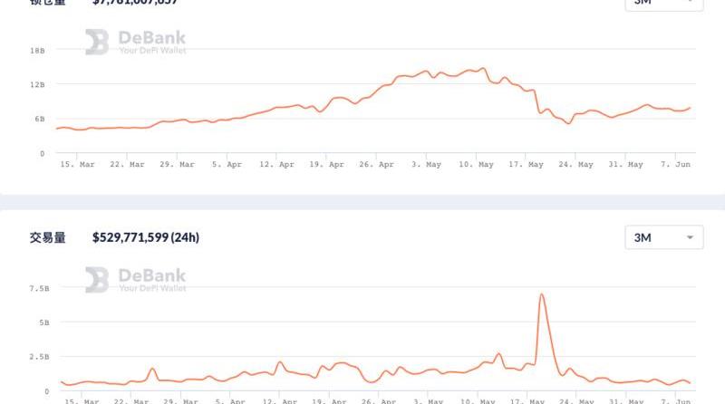 从趋势上可以看出,自五月中旬起,PancakeSwap应用内的锁仓量、交易量均有一定下滑。数据显示,PancakeSwap当前的总锁仓量为77.8亿美元,24小时内,交易量为5.29亿美元,交易笔数为95万笔,用户数量为25万人,合约交互次数为319万次。