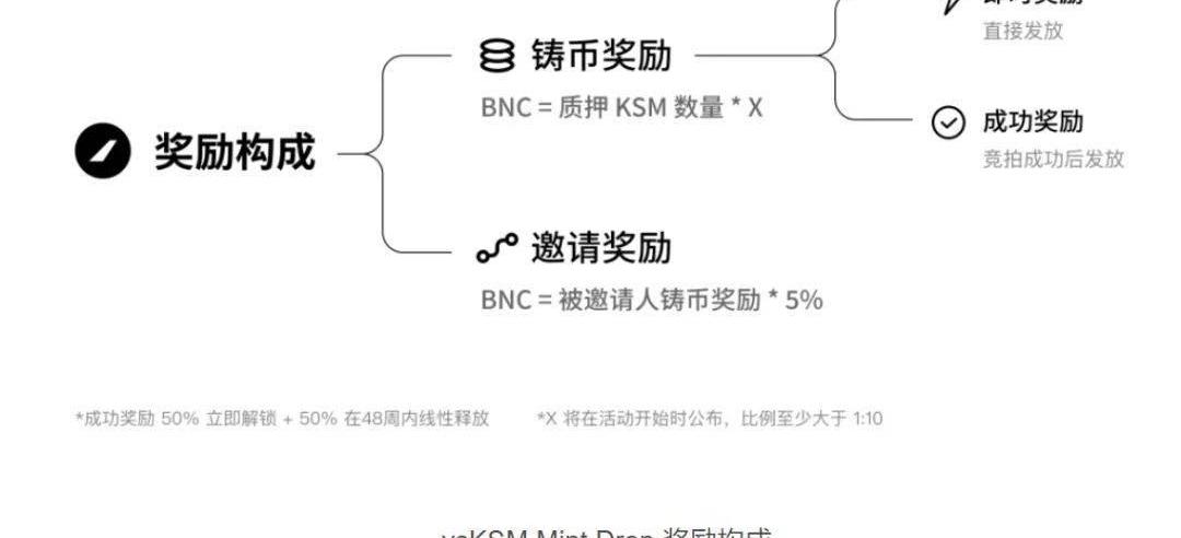 官方公布的奖励情况为:Kusama竞拍总奖励为3,000,000BNC;奖励天花板为250,000KSM;奖励比例为1KSM:11+BNC,50%上线解锁,剩余50%分48周线性释放;通过BifrostvsKSMMintDrop页面参与可1:1获得vsKSM和vsBOND;通过邀请码邀请好友,可获好友总奖励的额外5%BNC奖励加成。同时Bifrost会对所有已预约地址空投总计50,000BNC,空投将于北京时间6月11日22时进行发放。