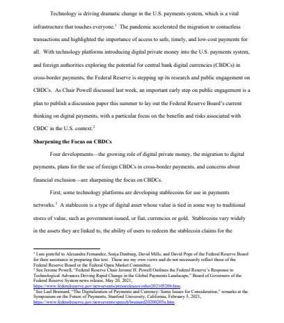 跨境支付是数字货币最引人注目的用例之一。众所周知,跨境支付的交易链条长、手续复杂、成本高且不透明。数字化以及中间商数量的减少,在降低跨境支付所需的成本、不透明度和业务时间等方面具有相当大的潜力。但是需要注意的是,如果想利用CBDC解决跨境支付问题,就必须在标准制定和防止非法跨境交易方面进行国际合作,以实现实质性改进。目前,我们正在通过国际清算银行、支付和市场基础设施委员会以及G7寻求与不同国家的合作。此外,我们正在参与多项国际项目,以提高跨境支付的透明度、及时性和成本效益。鉴于美元作为储备货币的重要地位,美国参与制定任何可能适用于CBDC的国际标准都非常重要。