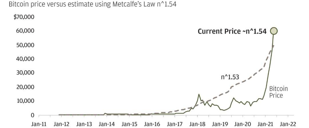 在考虑比特币时,Facebook的演变和梅特卡夫定律所捕获的网络价值是十分具有指导意义的。我们不是用Facebook作为比喻对象,并通过梅特卡夫定律将以获得一个并不精准的目标价格。我们也不会忽视Facebook网络可以通过广告更容易地进行变现的事实。这个类比所展示出的一个成熟网络的力量。如今,从各维度来看,比特币网络仍然不成熟,一共只有7000万个比特币钱包,全球采用率不到1%;这意味着新用户对价格的增量影响仍在上升。此外,以当前的比特币价格计算,广义梅特卡夫定律指数值为n^1.54。该指数表明比特币投资者对比特币的估值与梅特卡夫定律相符,然而价格却有偏离。?
