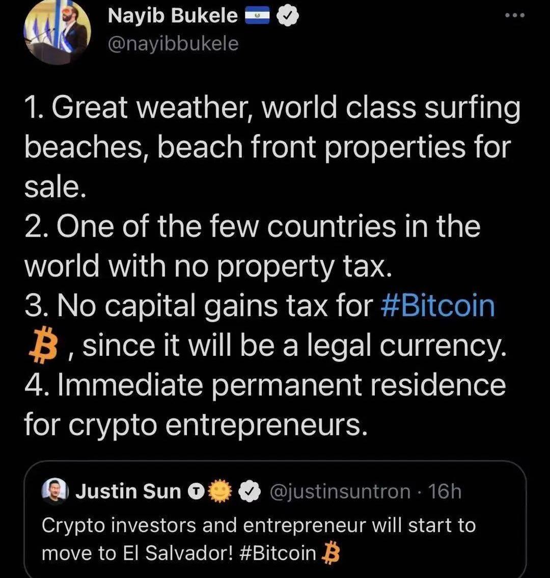 随后,萨尔瓦多总统还转发了币圈「话题之王」、波场首席执行官孙宇晨关于「加密投资者和企业家移居萨尔瓦多」推文,分析了萨尔瓦多对加密企业家的四大好处,分别是: