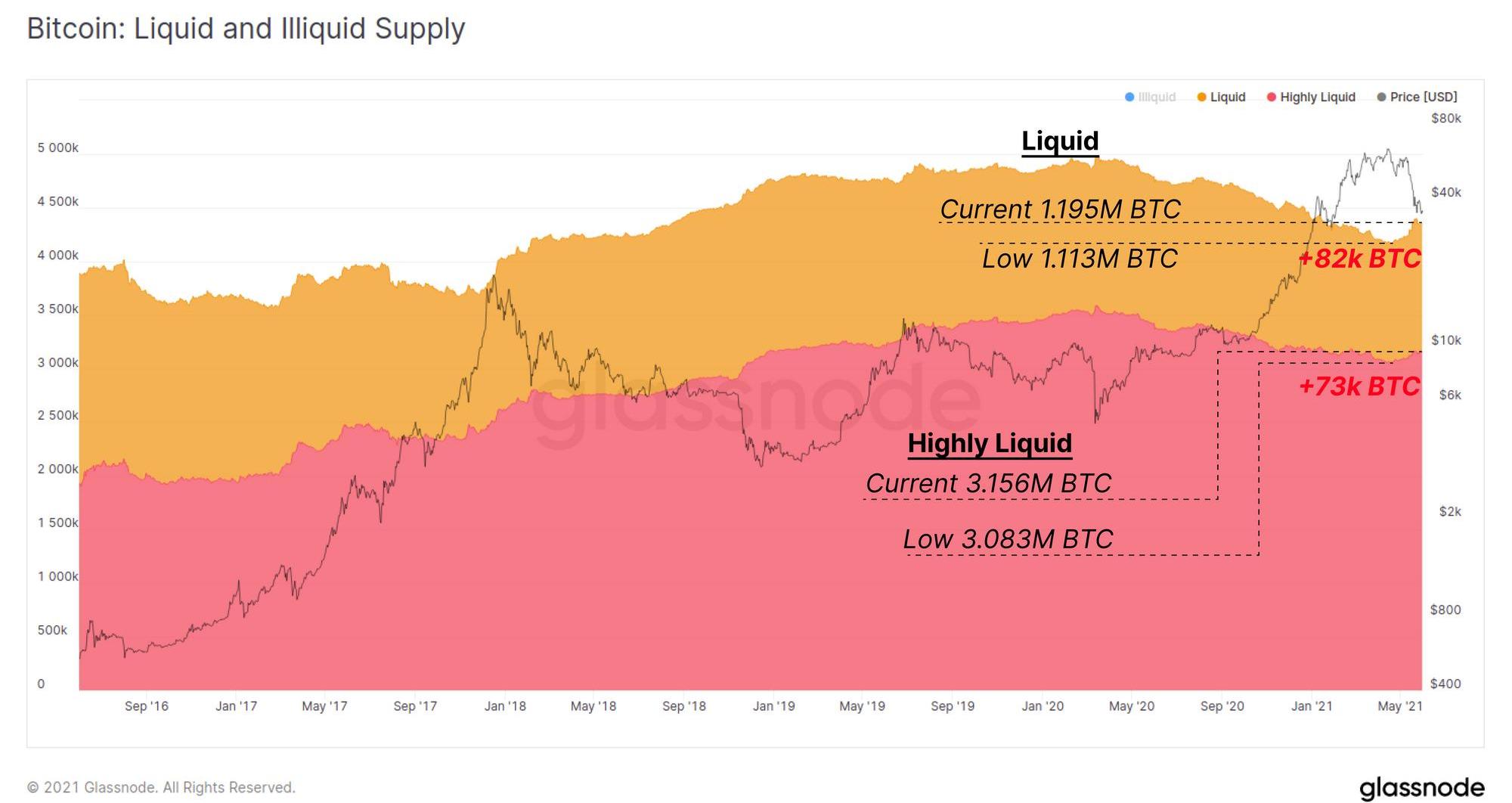 流动和非流动供应指标表示,在五月份,共有15.5万BTC已经从非流动性状态转变为流动性或高流动性状态,这可以预估总的抛售压力。