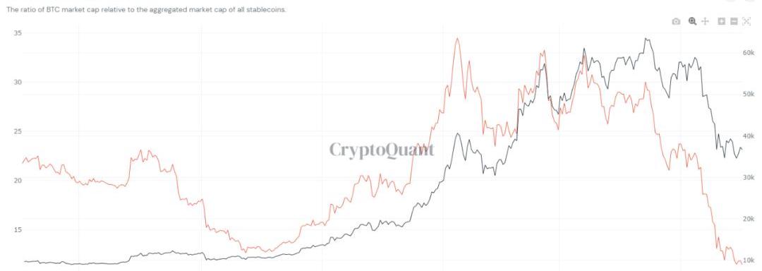 SSR这个指标可以用来衡量以美元计价的市场对比特币的购买力。它通过计算比特币市值和所有稳定币市值的比值得出。