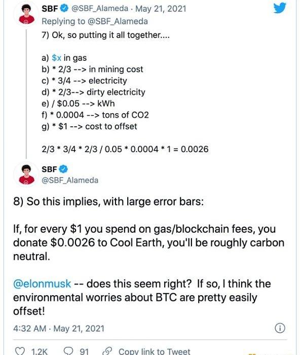SBF表示,这个结果告诉我们,如果你在手续费上面花费1块美金,你只要捐给CoolEarth0.0026美元,就能解决碳排放问题。他同时标注,批评比特币造成碳排放负担的特斯拉创办人马斯克。