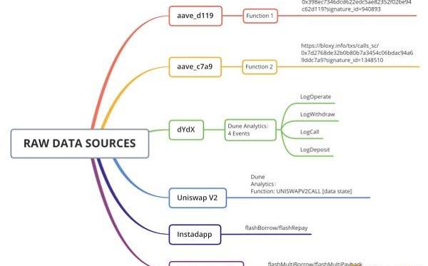 总体方法概括如图中所示,Aave直接为用户提供封装好的闪电贷函数,通过闪电贷函数调用情况追踪闪电贷交易哈希;dYdX则是基于四个事件日志获得交易哈希;UniswapV2的闪电贷链上交易数据通过DuneAnalytics的UNISWAPV2CALL确定交易哈希;Instadapp的交易数据获得方式与Aave一致,通过其闪电贷函数调用情况追踪获得。