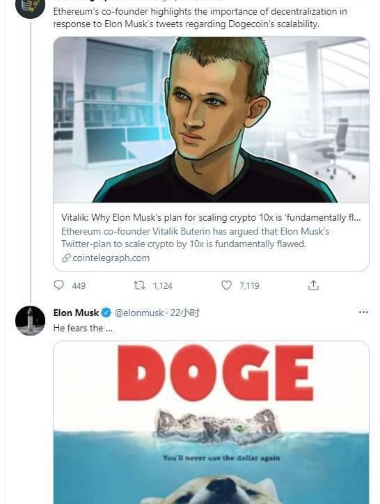 很快,马斯克对此做出回应,但只有一句话:「VitalikButerin害怕狗狗币。」