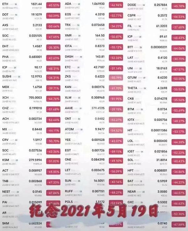 毫无疑问,比特币下跌其它加密货币也一起跟着进入下跌通道。以太坊最低跌至1736美元/枚,24小时跌幅超过45%,创2020年3月12日以来以太坊最大单日跌幅。