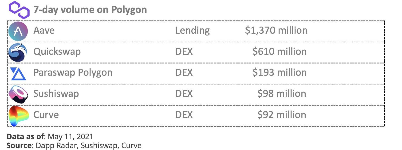 而Polygon也作为一种具有成本效益的DeFi协议选择突然出现在了这个舞台上。它最大的两个金融应用是Uniswap-fork的Quickswap和DeFi宠儿Aave。Polygon上的Aave自4月初推出以来,截至5月11日,已经吸引了超过33亿美元的锁定价值,约为Aavev2锁定价值的四分之一。Quickswap在4月份促成了7600万美元的日均交易量,约为Uniswap和SushiSwap同期平均交易量的6%和21%。