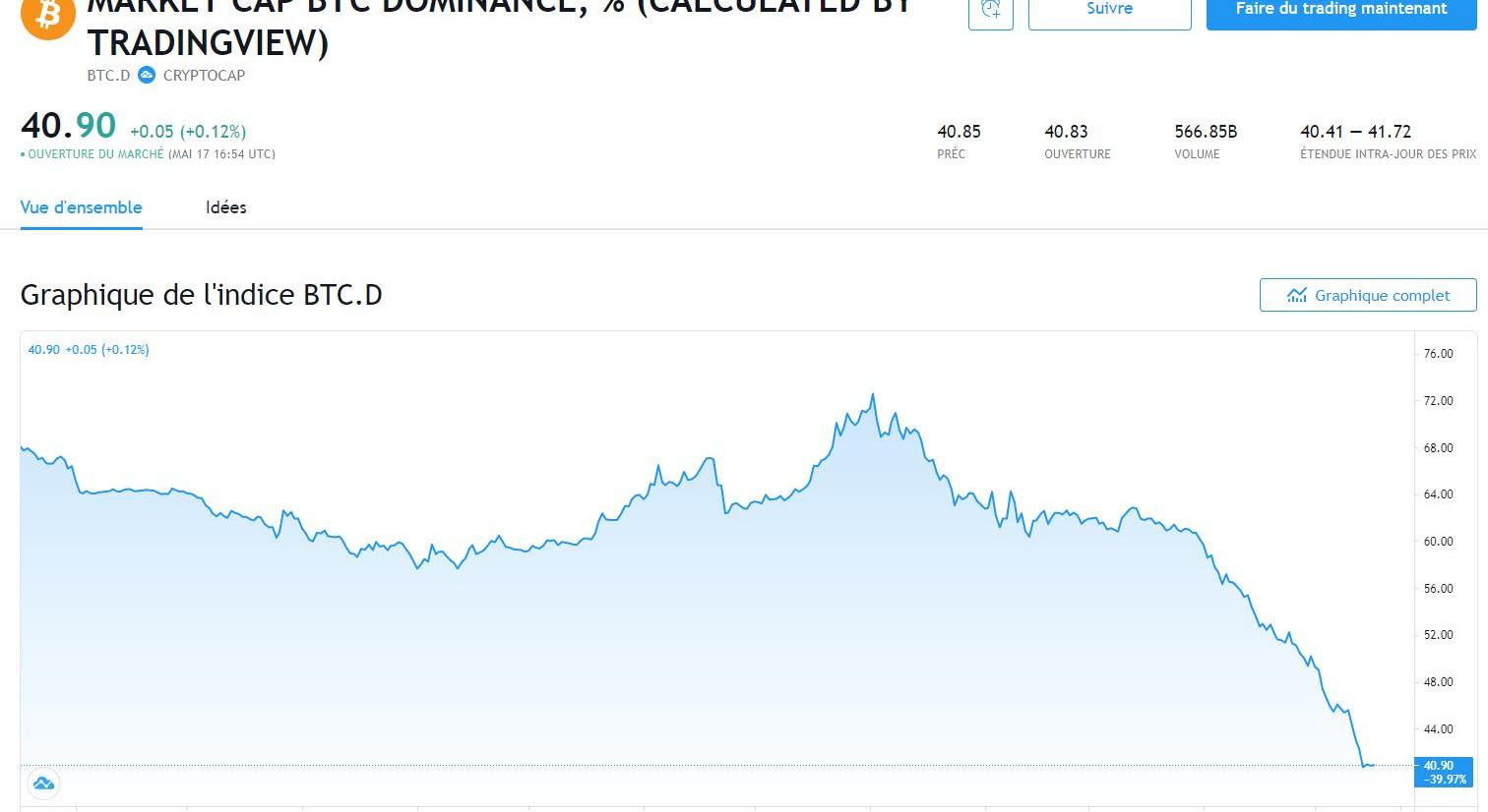 鉴于近期马斯克对于比特币毫不留情的推特攻势,其中也包括一部分比特币空头参杂其中,比特币未能顶住压力,开始向4.5万美元下方滑落,同时比特币也在逐渐失去市场份额,其市场霸主地位正在下降,据tradeview数据显示,比特币目前市值占比已经下跌40%附近。
