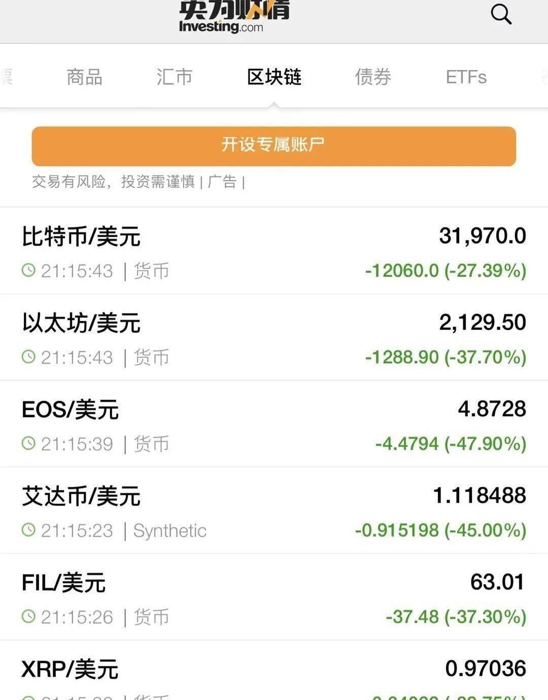 除比特币之外,其他加密货币更惨。以太坊暴跌近37%,EOS、艾达币等跌幅都接近50%。