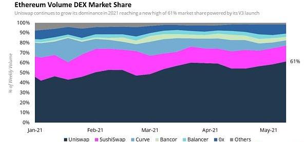 上图:自2021年以来以太坊上各大DEX的市场份额变化趋势,其中Uniswap的市场份额已经增长到了61%。